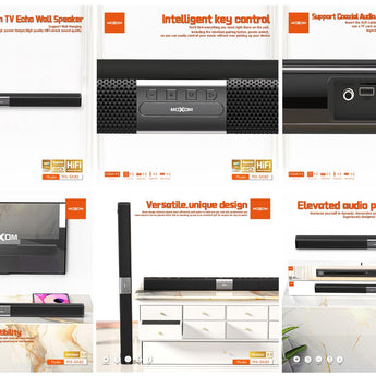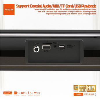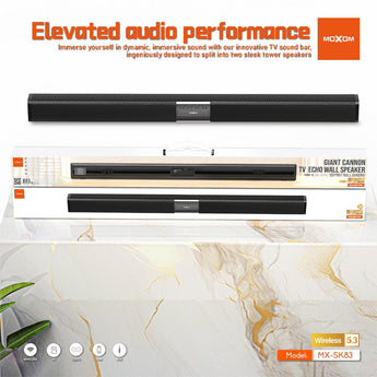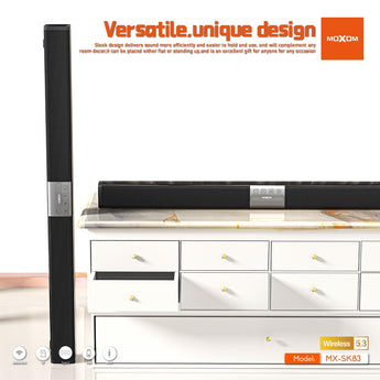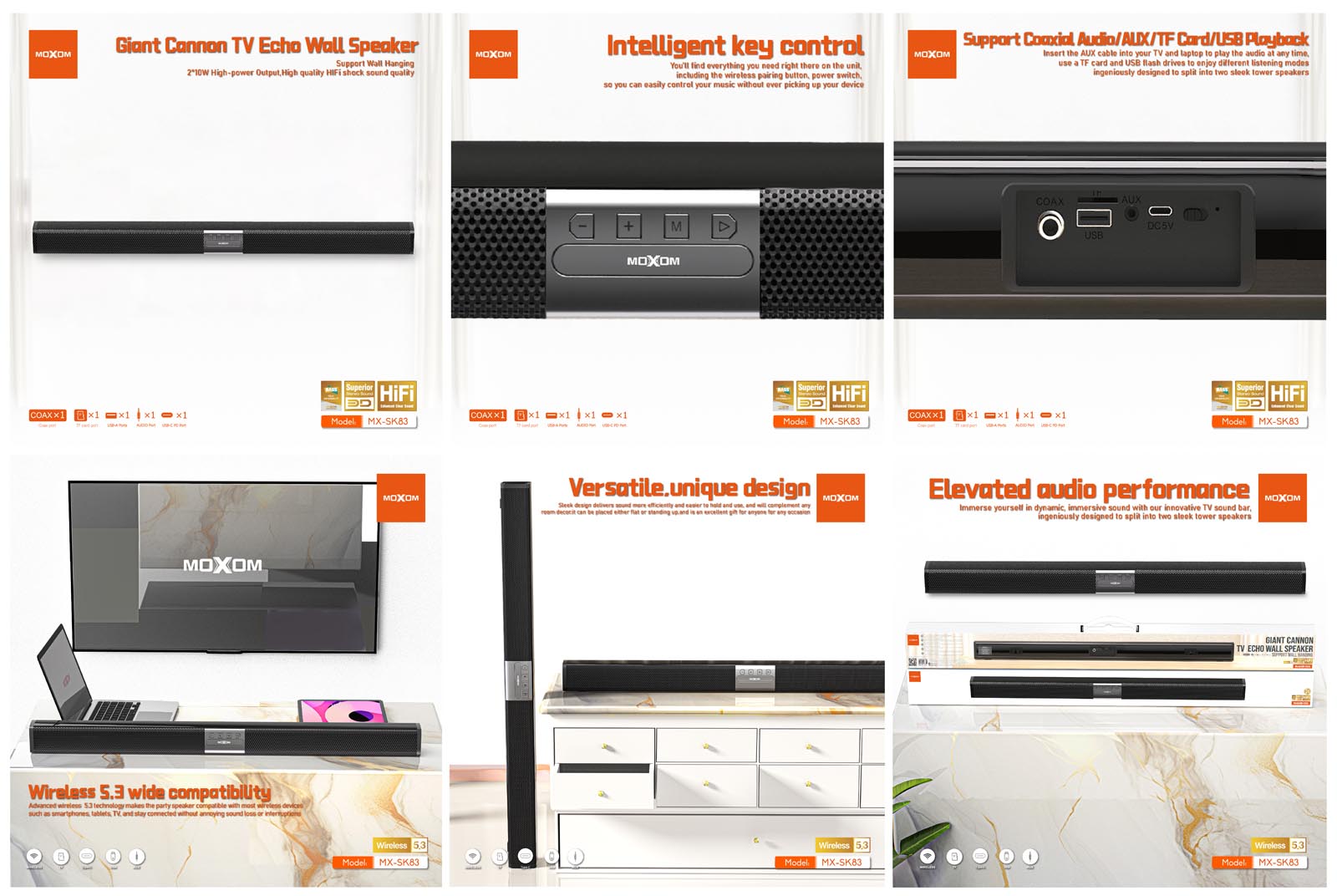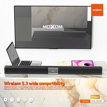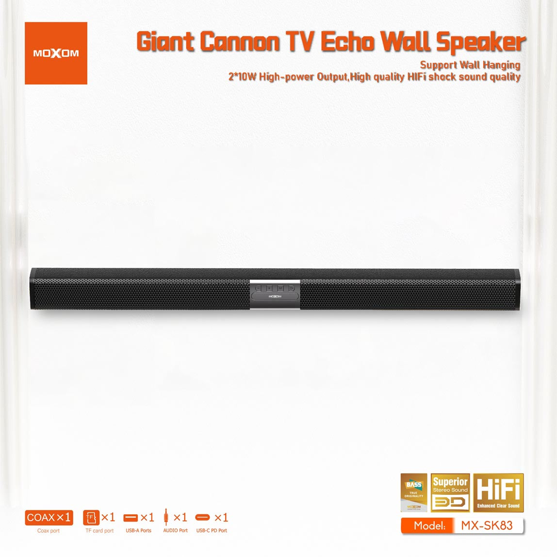 Moxom MX-SK83 është soundbar me dizajn elegant me formë “kanon gjigant” (Giant Cannon) që përshtatet mirë pranë televizorit ose të vendosur në mur. Ai ofron zë 20 W dhe mbështet lidhje të ndryshme: Bluetooth 5.3, COAX, AUX, USB playback dhe kartë SD (TF). Gjithashtu ka mundësi varjeje në mur dhe funksione të kontrollit të muzikës në pajisje multimediale.