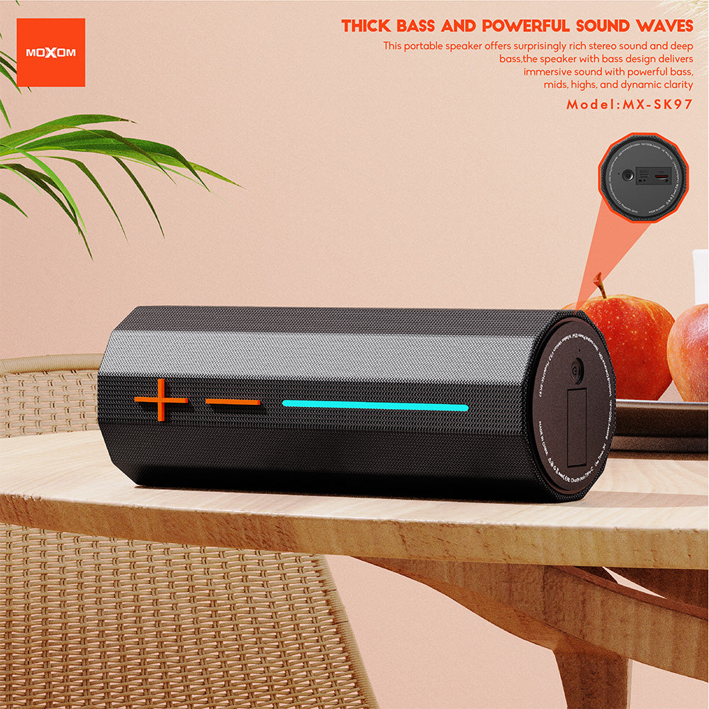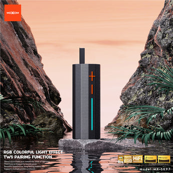 Moxom MX-SK97 është një altoparlant portativ me lidhje Bluetooth, i pajisur me funksion TWS (True Wireless Stereo) për t’u lidhur me një njësi tjetër dhe për të krijuar zë stereo. Ai ofron cilësi të lartë audio, ndriçim RGB shumëngjyrësh, dhe dizajn modern për përdorim brenda apo jashtë. Falë baterisë së fuqishme dhe përmasave kompakte, është ideal për festa, udhëtime ose përdorim të përditshëm.