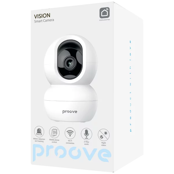 Proove Vision është kamerë sigurie Wi-Fi për monitorim të brendshëm, e përshtatshme për shtëpi, zyrë apo ambiente private. Me rezolucion 3MP, kënd shikimi 108° dhe rrotullim horizontal 355°, mbulon pothuajse të gjithë hapësirën e dhomës. Mbështet audio dy-drejtimëshe dhe ruajtje në microSD ose cloud.